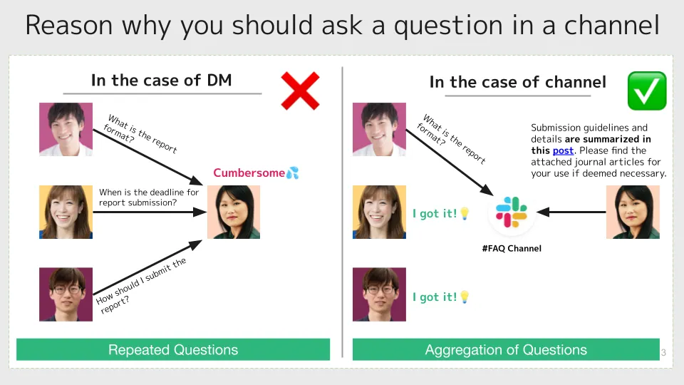 If you want to respond to a specific person in the channel, or if you want to notify them, you can use the mentions function to make it easier for them to see your message. (For details, see the “Receive Questions” section.)
