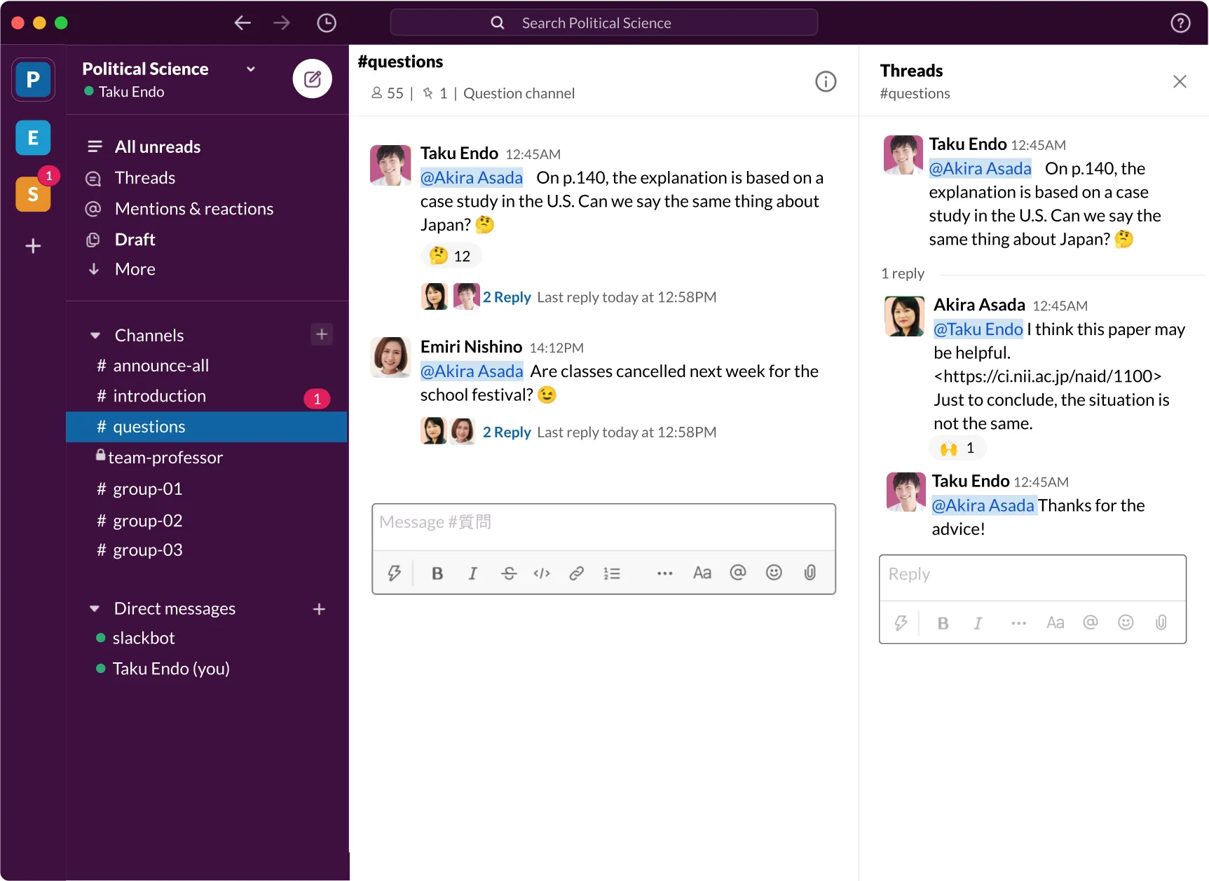Here we introduce how to use Slack effectively in class. As an example, we will use a fictitious course called “Political Science”.