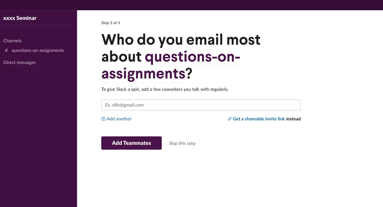 - Set up the workspace (e.g. class name). The “company or team name” will be the name of the workspace. It is recommended that you use a workspace name that makes its purpose easily recognizable (e.g. which class the workspace is for). In this example, the workspace is named “xxxx Seminar”.