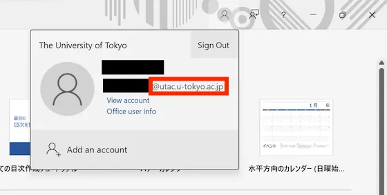 You are signed in with a Microsoft account in the Office app. Click the person icon in the upper right and check the account you are currently signed in with. If you are signed in with a different account other than UTokyo Account, select “Add an account.”