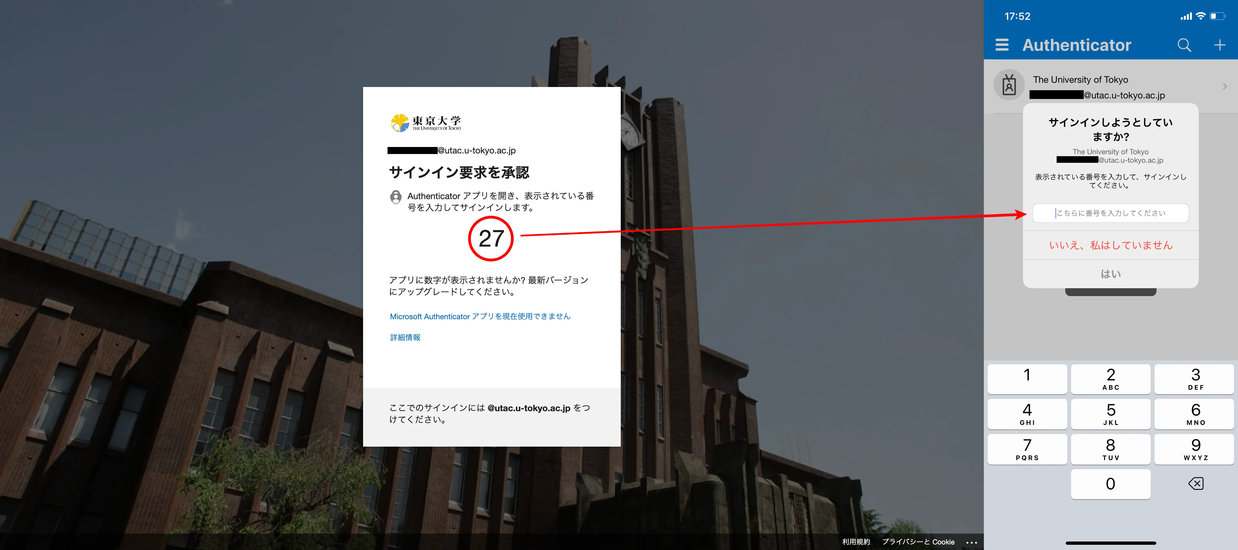 The “Microsoft Authenticator” application is one of the verification method for MFA in UTokyo Account. Starting February 27, the procedure for approving notifications on your phone when signing in using the “Microsoft Authenticator” app will be changed to enhance security.