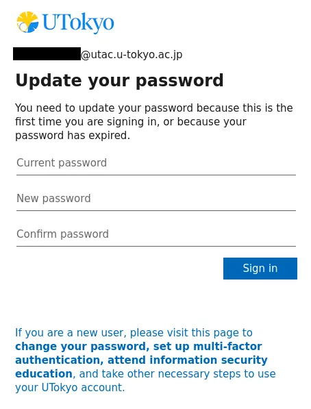 Please sign in to the “View Your UTokyo Account User Information” below with your UTokyo Account and initial password indicated on the notification.