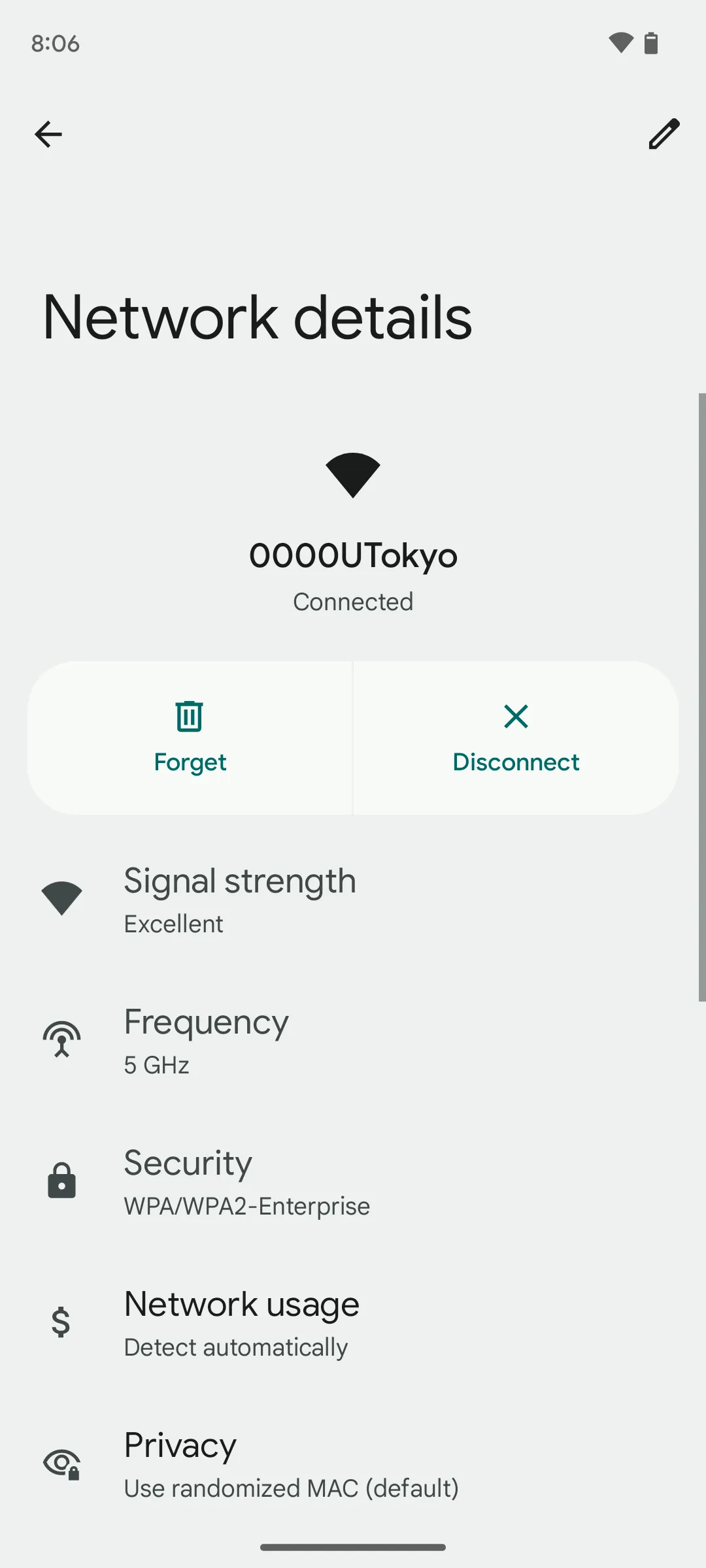 If the screen for entering a ID and a password does not appear in Step 2 and it fails to connect to the Wi-Fi, you need to delete the existing setting and register a new one. This is necessary because although once you reissue your account and your previous account becomes invalid, your devices may still store it. Before using the new account, your devices must “forget” the previous one. There is no need to worry about never being able to connect to the UTokyo Wi-Fi again upon “deleting” a account.Tap the SSID found in Step 2 to open the screen of “network details”. Delete the setting information on the screen of network details.