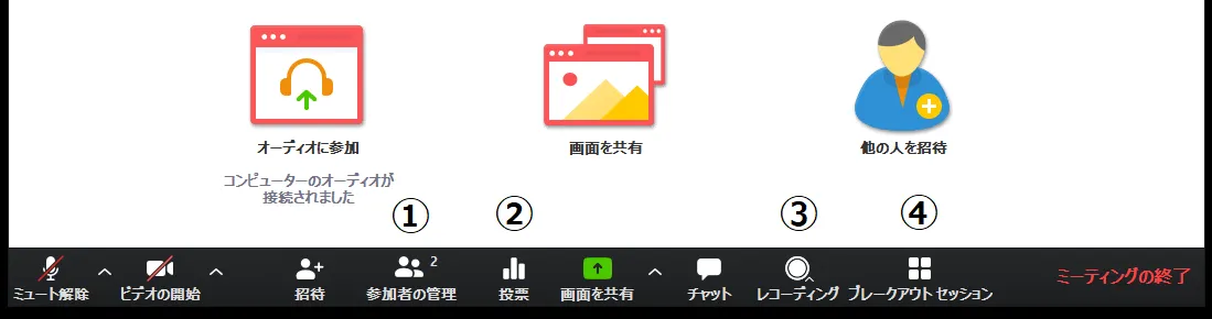 1. Microphone mark : Press this to mute (mute) or unmute (the screen shows “mute off” because it is currently muted). Pressing the arrow mark next to it enables you to make settings related to the microphone.