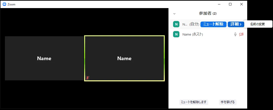 • Hover the mouse cursor over your name to turn mute on / off and change the name displayed by clicking on “details”